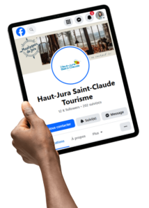 Affichage de la couverture Facebook de l’Office de Tourisme de Haut-Jura Saint-Claude aux couleurs de la campagne Montagnes du Jura