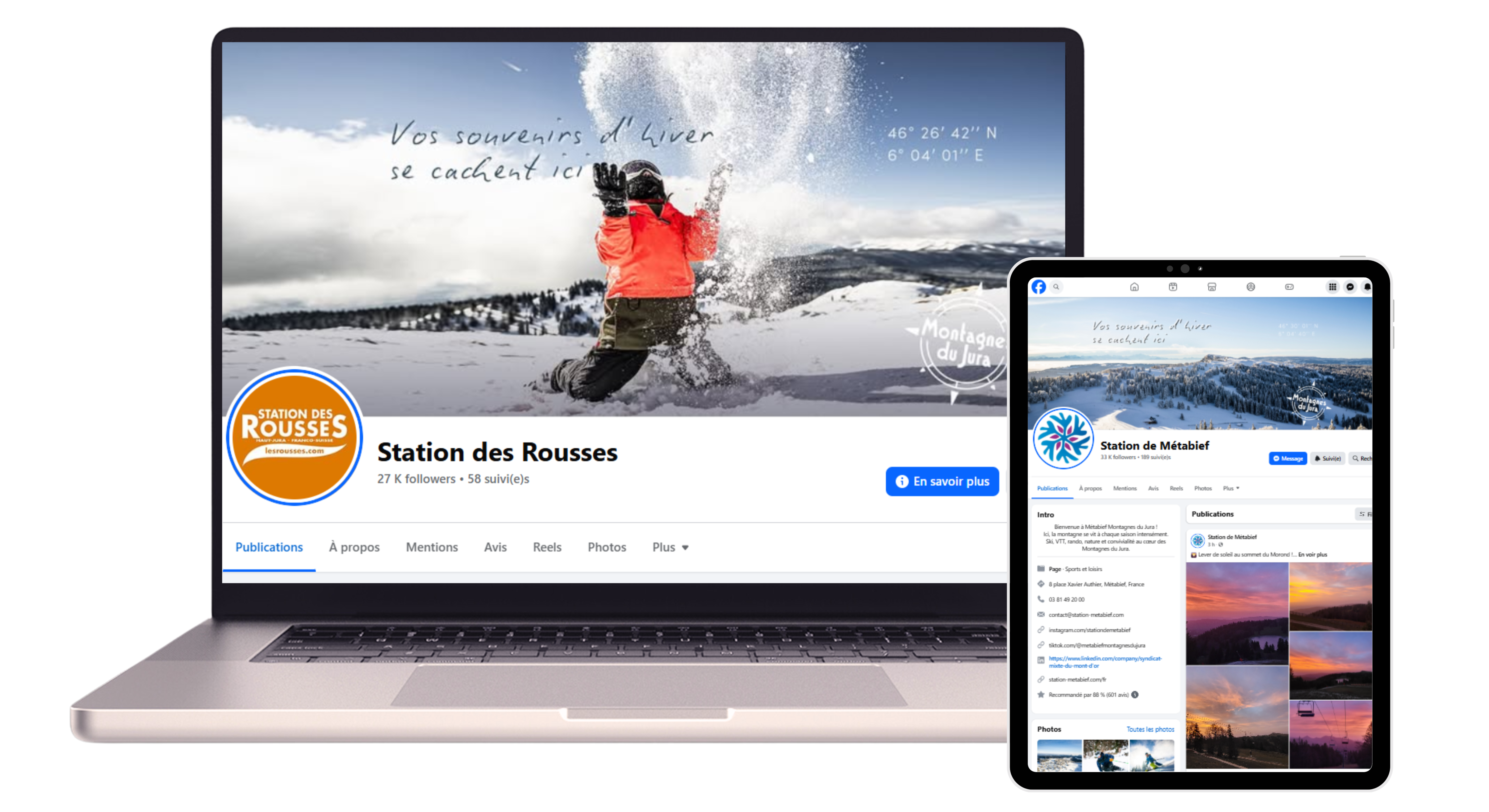 Affichage de la couverture Facebook des stations de Métabief et des Rousses aux couleurs de la campagne Montagnes du Jura